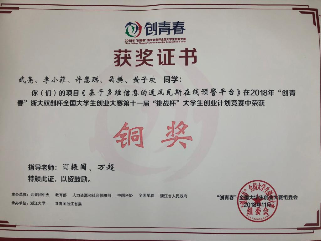 1031日至113日,2018创青春浙大双创杯全国老员工创业大赛在浙江大学落下帷幕。本届大赛由共青团中央、教育部、人力资源和社会保障部、中国科协、全国学联、浙江省人民政府主办,浙江大学、共青团浙江省委承办。经过校赛、省赛、网络评审层层选拔,学院报送的由闫振国、万超老师指导,武亮、李小菲、许慧聪等同学完成的基于多维信息的通风瓦斯在线预警平台项目时隔四年再次荣获国家铜奖。