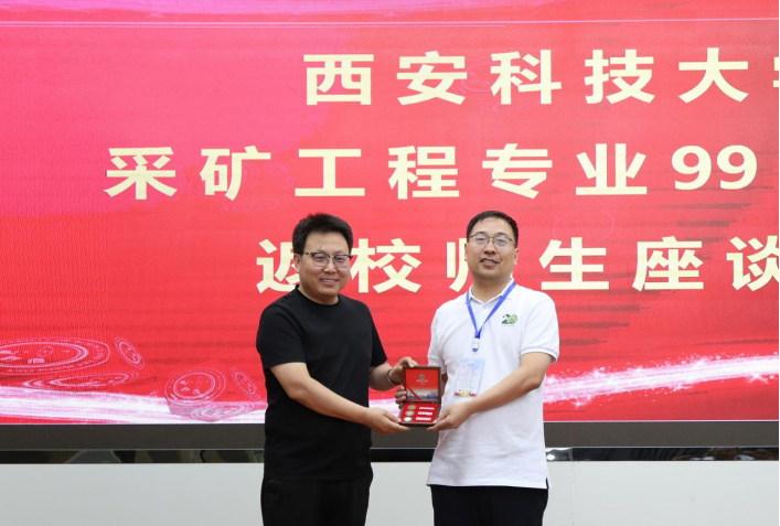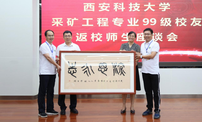 最后,采矿工程专业99级员工向学院捐赠了纪念牌匾。对外联络与合作处副处长张旭东代表学校向员工赠送了校徽纪念品。