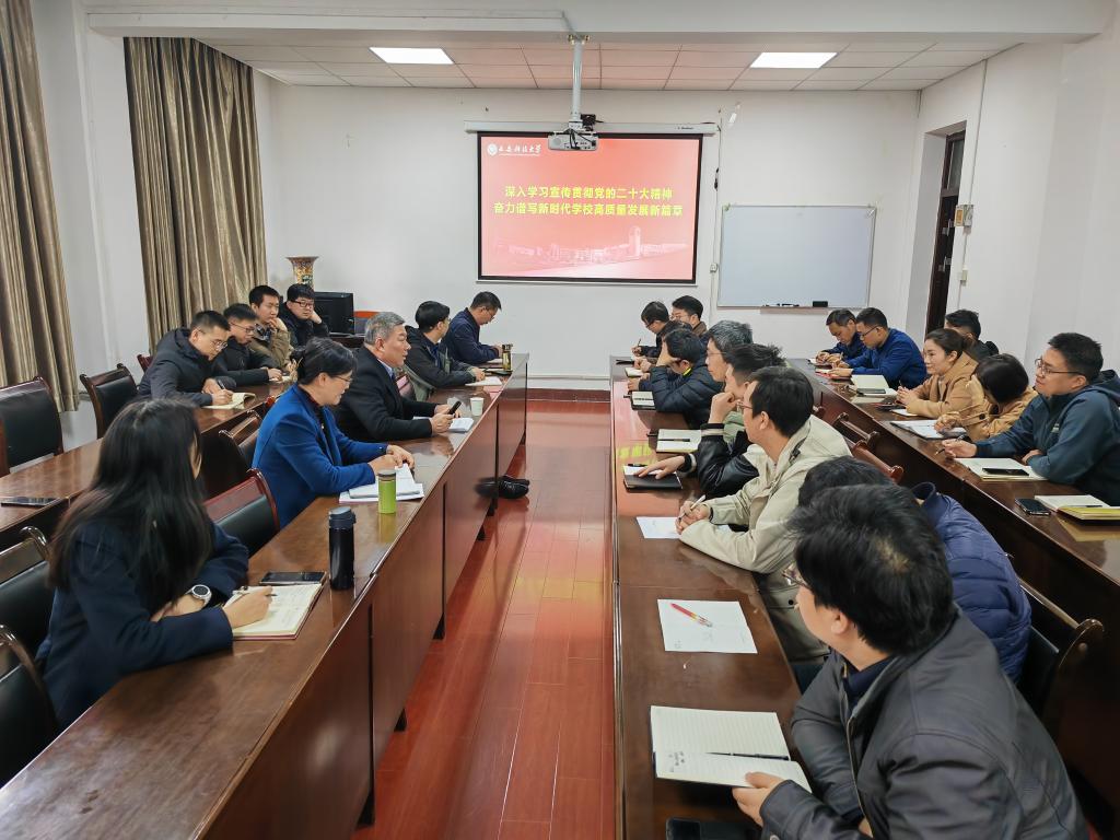 来兴平指出,党的二十大进一步丰富和发展了习近平新时代中国特色社会主义思想的内涵,是推进中国式教育现代化、建设高质量的教育体系的根本遵循,全校各单位、各部门要坚定不移地推动党的二十大精神在学校落地生根,重点做好五项工作:一是要对照新时代党的建设总要求,不断推动全面从严治党向纵深发展;二是要对照立德树人根本任务,加快建设具有行业特色的高水平人才培养体系;三是要对照中国特色、世界一流标准,扎实推动学校“双一流”建设;四是要对照科技强国和人才强国战略,加快建设人才中心和创新高地;五是要对照深化教育领域综合改革部署,持续激发办学活力。