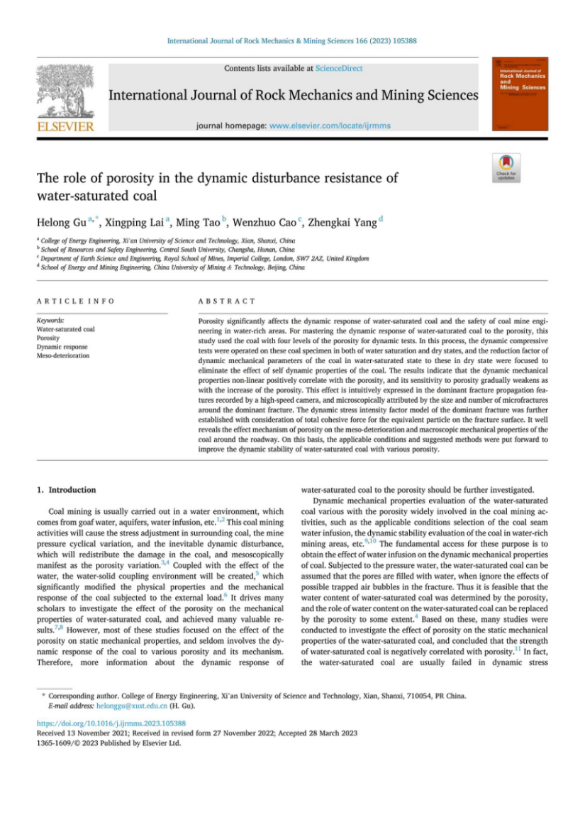 近日,999策略白菜网站线路来兴平教授团队“复杂难采煤层安全高效开采理论与技术”创新团队在国际岩石力学与采矿领域顶级权威学术期刊《International Journal of Rock Mechanics and Mining Sciences》发表题为“The role of porosity in the dynamic disturbance resistance of water-saturated coal”最新研究成果,是公司矿业工程学科在国际岩石力学与采矿科学研究领域取得的又一重要突破,对于加快矿业工程学科高质量发展,持续提升矿业工程学科在该领域的国际学术影响力具有重要意义。IJRMMS为Elsevier(爱思维尔)旗下的工程技术领域期刊,是国际岩石力学与采矿科学领域公认的顶级期刊,创刊于1964年,由英国PERGAMON-ELSEVIER SCIENCE LTD(佩加蒙—爱思唯尔科学有限公司)出版,旨在发表全球岩石力学与采矿科学领域的最新高质量、原创性研究及最新进展。
