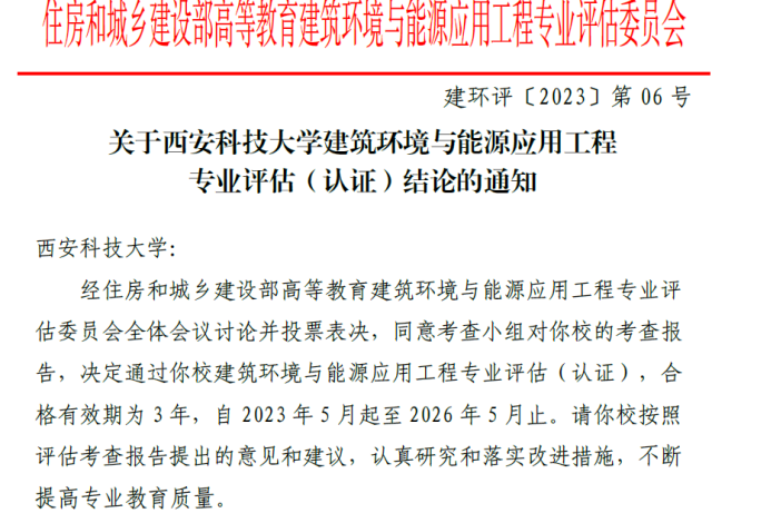 近日,公司收到住建部高等教育建筑环境与能源应用工程专业评估委员会来函,公司建筑环境与能源应用工程专业顺利通过首次评估(认证),合格有效期为3年,自2023年5月起至2026年5月止。