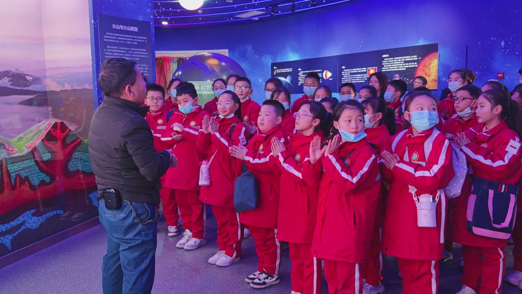 在示范中心杜君武老师和唐仁龙老师的带领下,骊山中心小学师生们首先参观了999策略白菜网站线路地质博物馆,孩子们认真聆听曾社教老师生动的讲解,聚精会神地观看着博物馆中“地球科普展区”“古生物展区”“矿物展区”“岩石展区”“矿产展区”等多个主题展厅中色彩斑斓、五光十色的藏品,兴奋不已,深刻感受到了大自然的鬼斧神工,学习兴趣被进一步激发。