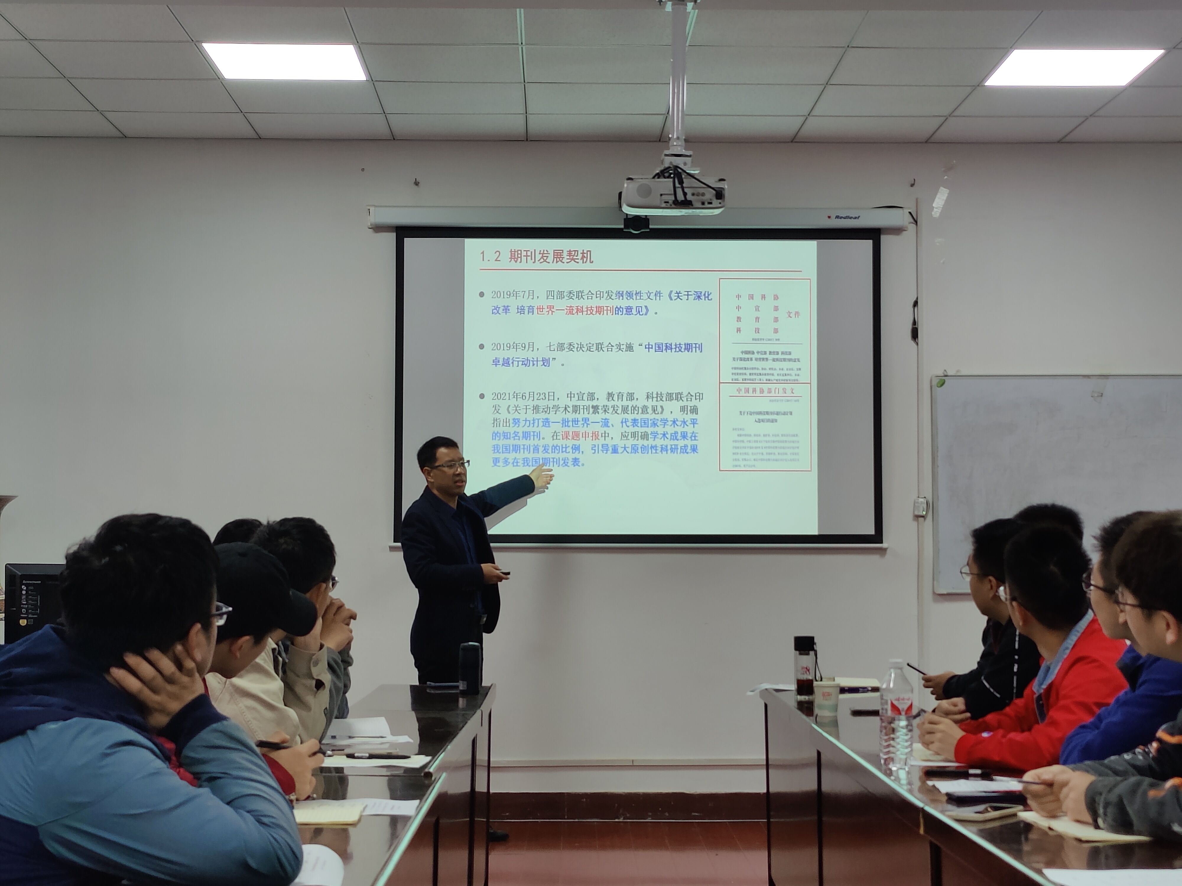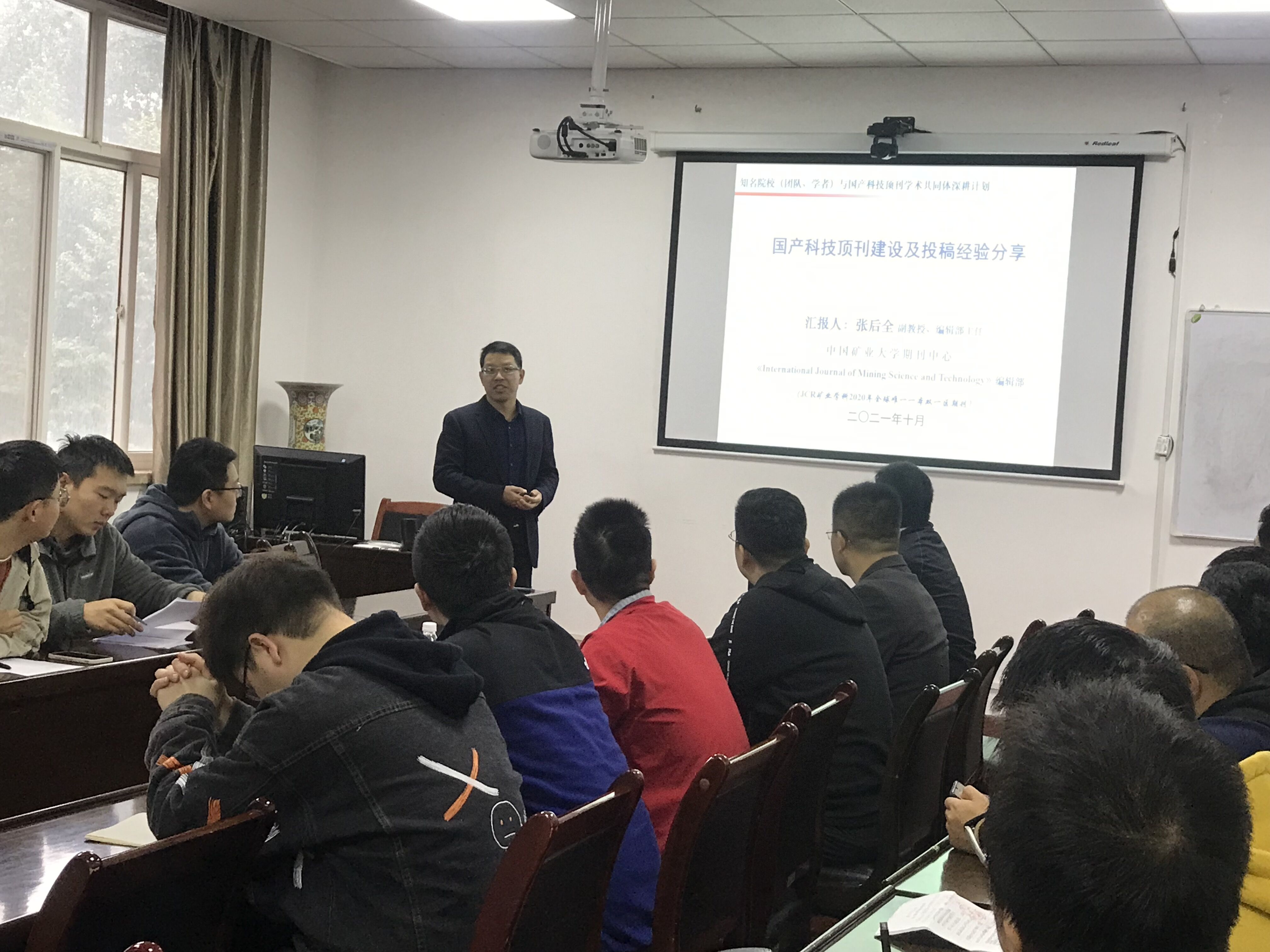 2021年10月14日上午9时,中国矿业大学期刊中心编辑部主任张后全副教授于采矿楼310会议室为999策略白菜网站大厅师生做了题为“国产科技顶刊建设及投稿经验分享”的学术报告。999策略白菜网站大厅部分教师及全体博硕士研究生参加,本次报告会由采矿系主任丁自伟教授主持。