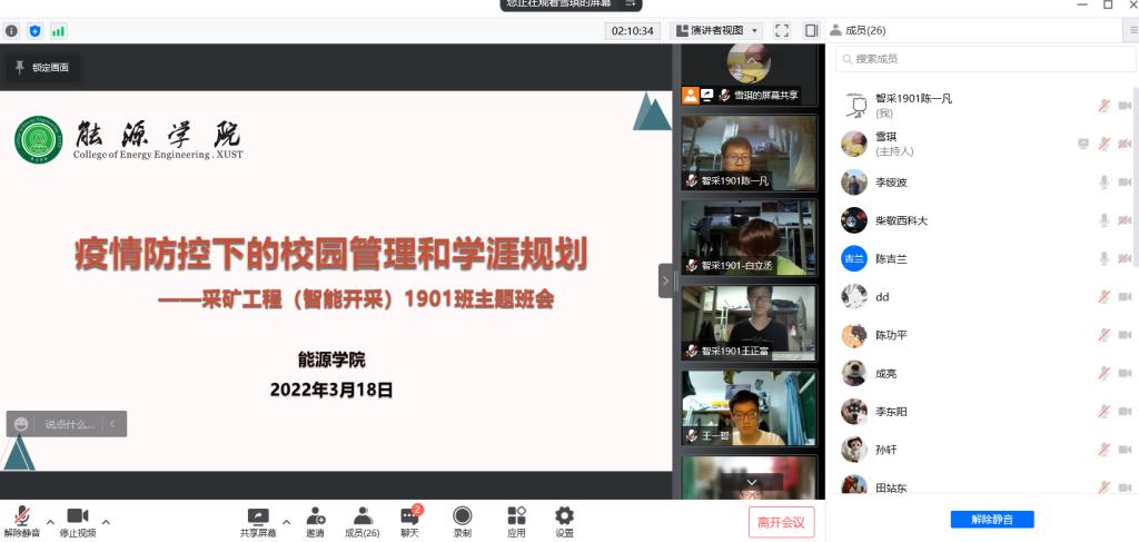 3月18日,999策略白菜网站大厅采矿工程(智能开采)1901班召开“疫情防控下的校园管理和学涯规划”线上主题班会,公司党委书记陈吉兰,经理柴敬,党委副书记李绥波,院办主任、公司党委组织员杨创明,班主任王红伟以及采矿工程(智能开采)1901班全体同学参加了会议。会议由辅导员王雪琪主持。