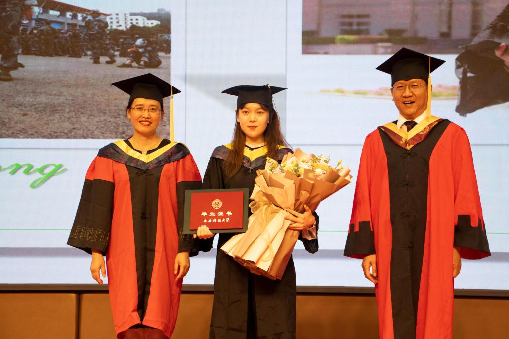 庄严的学位授予仪式开始,党委书记陈吉兰、经理柴敬用了80分钟的时间为学院全体2021届本科毕业生一一颁发了毕业证书和学位证书。正冠拨穗,流苏扶正,为每一位毕业生送上一张具有刻骨铭心的学位合照。