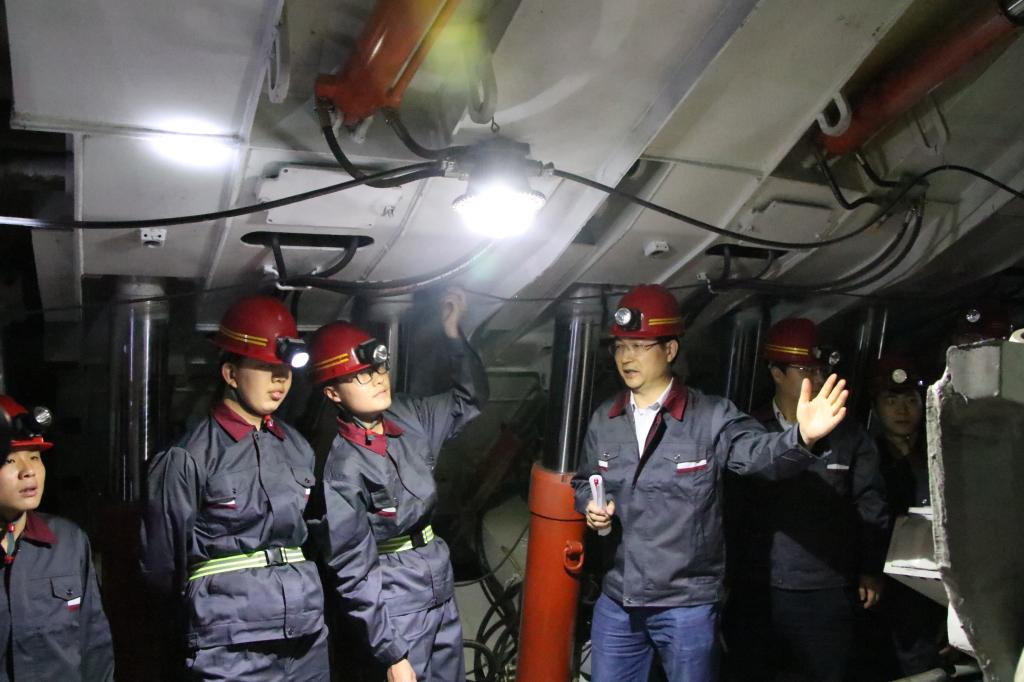 会后,师生共同走进煤炭主体专业综合实验实训中心参观模拟地下矿井。30余名团员青年跟随黄教授的步伐,打开沉重的风门,模拟地下矿井的面纱逐渐掀开。井底车场、中央水泵房、中央变电所、运输顺槽、采煤工作面、回风顺槽、避难硐室等一一跳入眼帘,展现了现代化矿井安全、高效的模式。