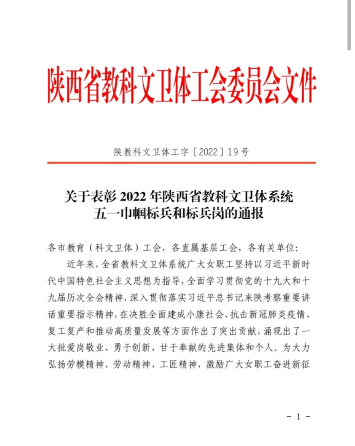 4月26日,根据陕西省教科文卫体工会委员会文件《关于表彰2022年陕西省教科文卫体系统五一巾帼标兵和标兵岗的通报》,公司党委书记陈吉兰荣获“陕西省教科文卫体系统五一巾帼标兵”称号。
