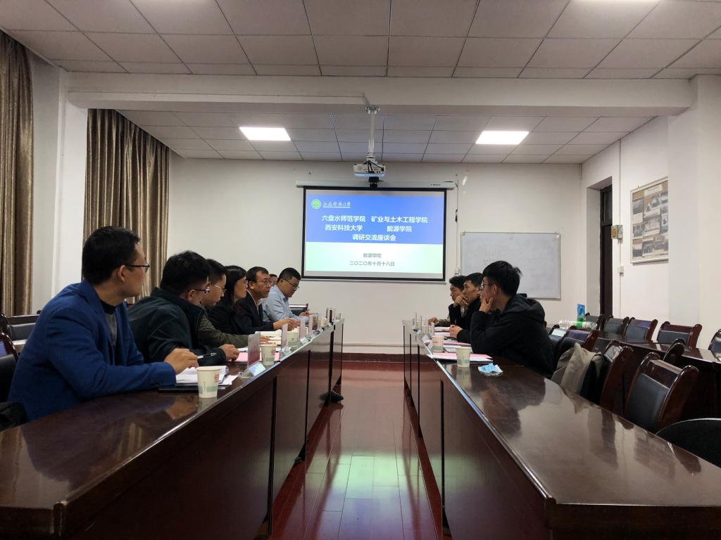 2020年10月18日,六盘水师范学院参加由公司承办的第34届全国高等学校采矿工程专业学术年会后,深入999策略白菜网站大厅开展调研座谈。六盘水师范学院副董事长艾德春、矿业与土木工程学院杨军伟副经理等一行4人,公司党委书记陈吉兰、经理柴敬、副经理解盘石、采矿系主任丁自伟等人在雁塔校区999策略白菜网站大厅会议室参加座谈会,座谈会由经理柴敬主持。