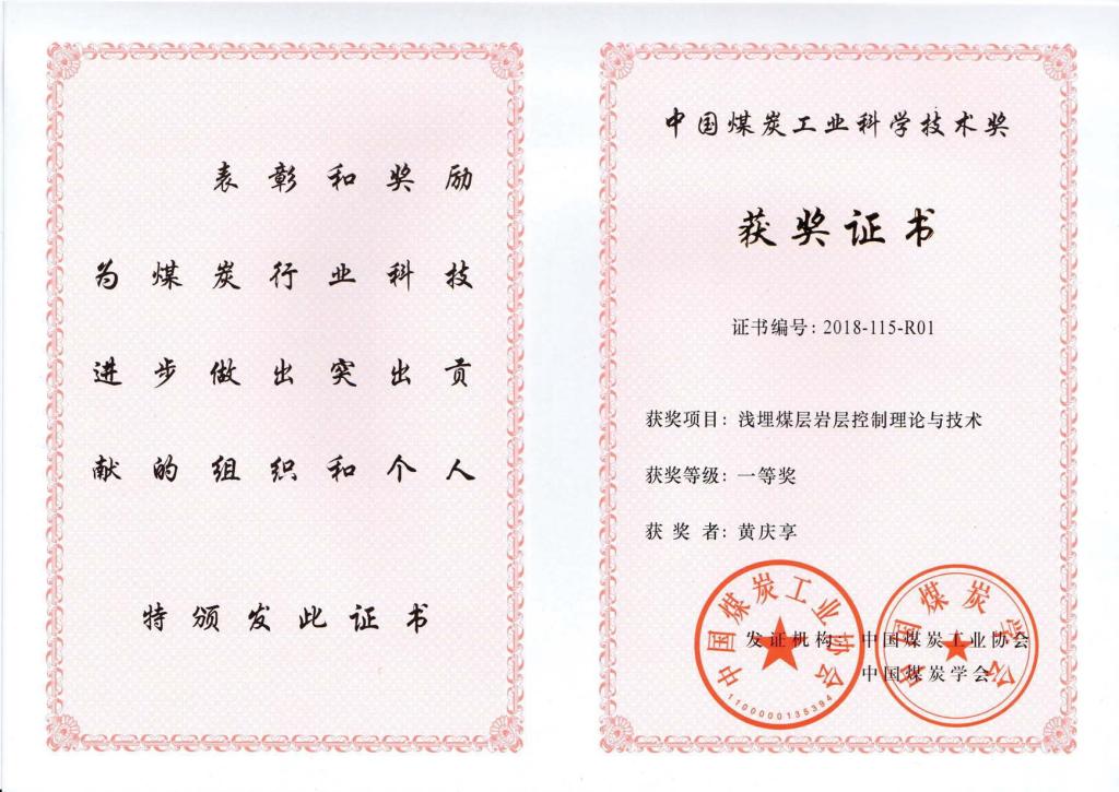 热烈祝贺999策略白菜网站大厅黄庆享教授团队获得中国煤炭工业科学技术一等奖